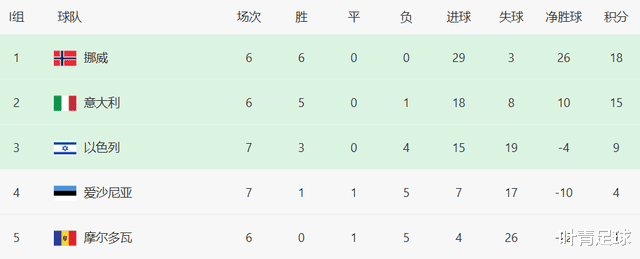 I组积分榜上,挪威6战全胜18分名次榜首,净胜球多达26个;意大利6战15分排在第2位,净胜球为10个。本轮世初赛,挪威主场迎战爱沙尼亚,意大利客场挑战摩尔多瓦。