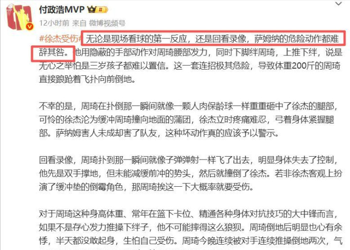 徐杰的伤诚然不重,萨姆纳的动作却成了众矢之的。