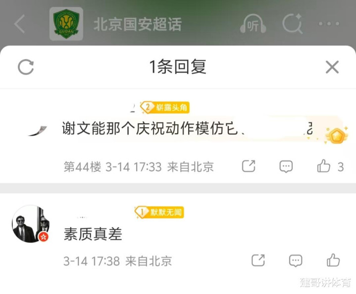 北京本事3月14日,中超第二轮山东泰山主场和北京国安队的比赛,以山东泰山队2-1投降北京国安为止,为山东泰山队领先进球的谢文能,没思到果然成为了北京国安球迷动怒爆粗口的球员。在北京国安官网更新动态,发布了张玉宁为北京国安得到进球的音讯后,一些北京球迷再也无法隐忍对谢文能的动怒,平直在国安官网下爆出对谢文能的粗口。