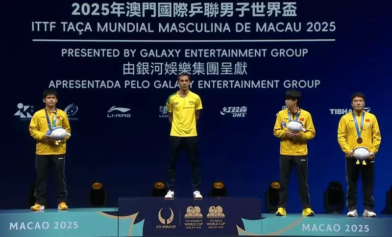 赛后男单受奖典礼,国乒林诗栋、王楚钦、梁靖崑以及巴西选手雨果登上领奖台,领取奖杯。