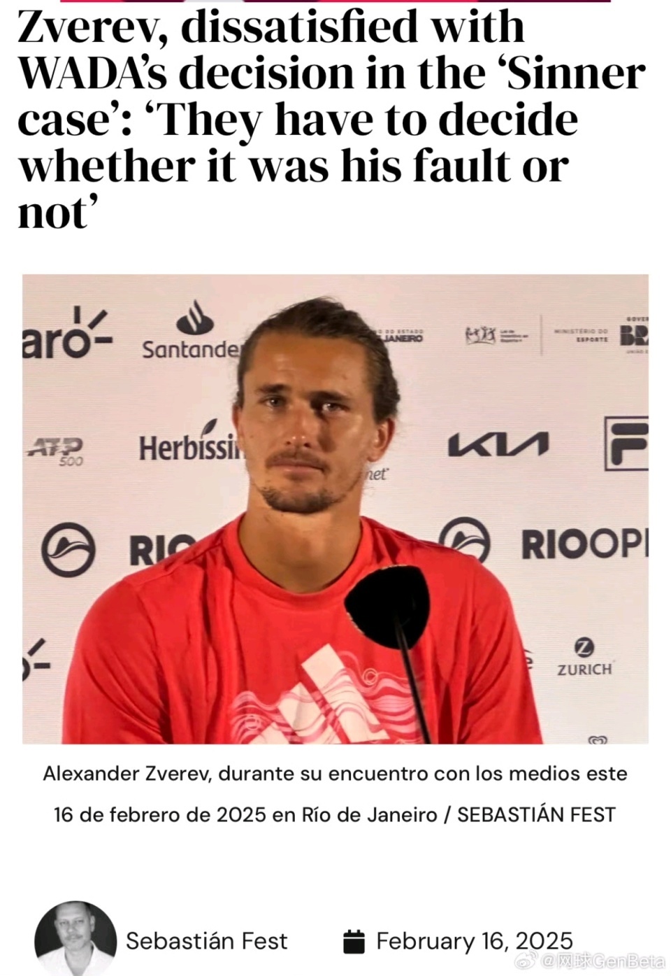 网球男单天下第一辛纳与天下反愉快剂机构已毕妥协条约,将会在2月9日到5月4日之间禁赛3个月,对此,天下第二兹维列夫提议质疑。